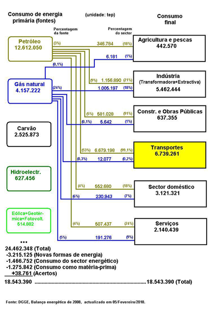A figura seguinte ilustra o peso do gás natural em Portugal, como fonte de energia, que segundo dados do Balanço energético de 2008, da Direcção-Geral de Geologia e Energia (DGGE), foi nesse ano de 17%. Mostra ainda os sectores que utilizam esse gás natural como fonte de energia (consumo final), sendo por ordem decrescente: indústria, sector doméstico, serviços, transportes, construção e obras públicas e agricultura e pescas.